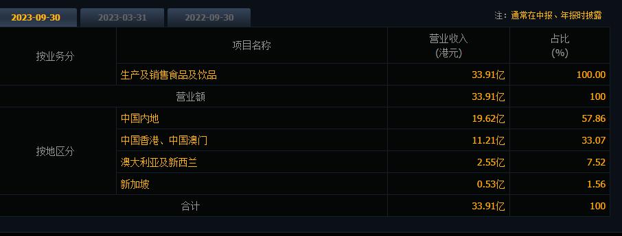 2023年9月,维他奶在中国内陆的销售额仅19.62亿港元,相比于2022年同期的22.16亿港元,下滑近11.5%。与此同时维他奶内陆业务占比也从60.84%下滑到了57.86%。