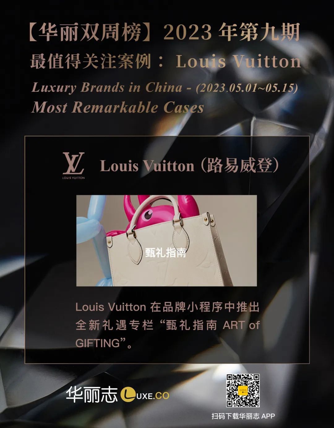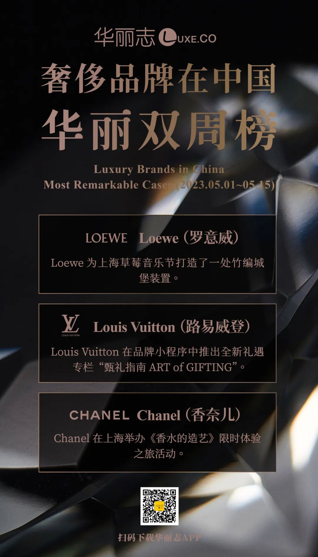 2023年5月1日 – 2023年5月15日,【华丽双周榜】共收录26家奢侈品牌在中国市场的31条动态,其中包含12条营销动态、5条门店拓展/焕新动态、11条开设快闪店的消息、1条线上渠道拓展信息、2条中国艺人代言的消息。