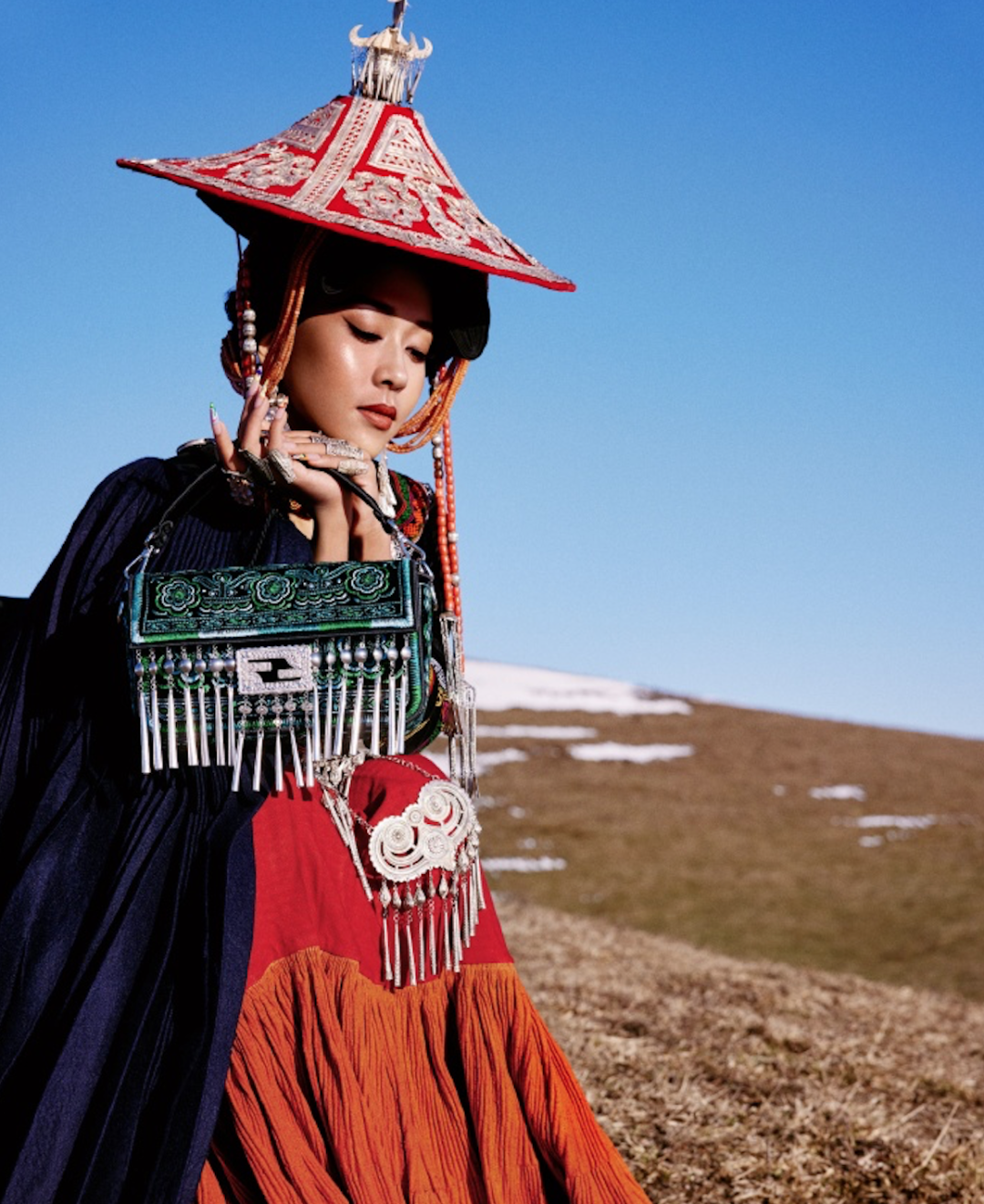 4)意大利奢侈品牌 Fendi(芬迪)联合歌手吉克隽逸共同探索中国传统手工艺之美,邀请彝族非物质文化遗产传承人——阿西巫之莫和勒古沙日,为 FENDI 'hand in hand'匠心艺术展,打造极具彝族悠久艺术余韵的 Baguette手袋。