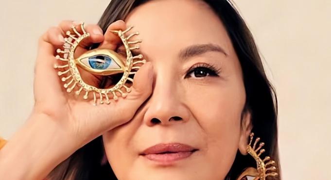 功夫女星杨紫琼,因为带了全知之眼的项链,还特地摆了只露出一只眼睛的 Pose ,可疑。