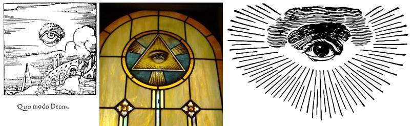从左到右:17 世纪的全知之眼;基督教三位一体的理性之眼;共济会早期徽章图案。