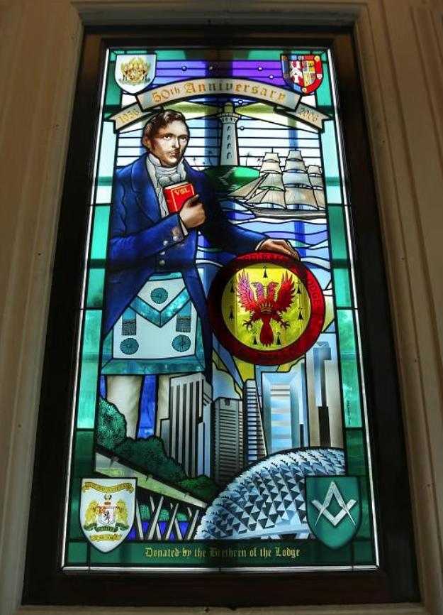 新加坡共济会的会所坐落在哥里门街的菲美胜堂,下图为菲美胜堂彩窗,其中右下角的图案就是共济会的象征符号,由圆规跟方尺构成。