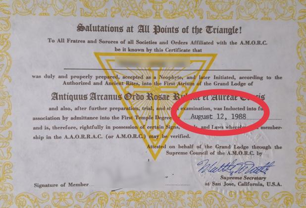 “1988 年我是玫瑰十字会兄弟、 1991 成为马丁会兄弟,两者和共济会乃至光明会属于同渊源传承,无法分开,无论传承、架构、仪式、气氛都差不多,我不是共济会成员,不过认识很多悉尼共济会兄弟,既被邀请进入过建筑内部,也被邀请过成为兄弟 ” 。