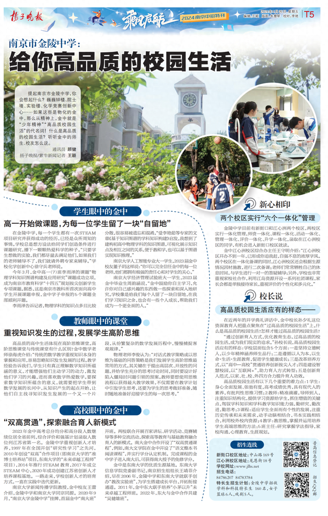 提起南京市金陵中学,你会想起什么?巍巍钟楼、院士墙、实验楼、化学竞赛创新中心……如果这些是物化的金中,那么从精神上,金中就是“少年精神”“高品质校园生活”的代名词!什么是高品质的校园生活?听听金中的师生、校友怎么说。