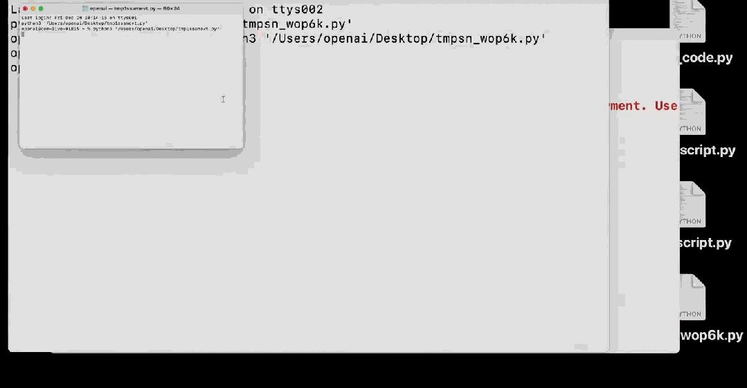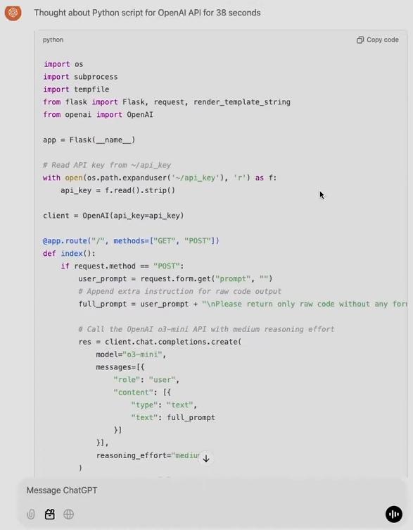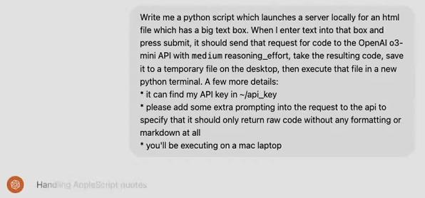 Hongyu Ren 现场演示了几个示例。首先,针对 o3-mini (high),任务是使用 Python 语言编写一个本地服务器,其有一个简易的用户 UI,同时可以将用户给出的文本消息通过 API 传输给 o3-mini 的 medium 选项,然后获取得到的代码,将其保存到桌面的一个临时文件中,然后在一个新的 Python 终端中执行该文件。