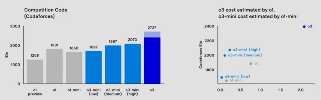 与 o1 相比,o3-mini 在 Codeforces 上的性能具有显著的成本效益,这使其成为一个非常适合用来编程的模型。
