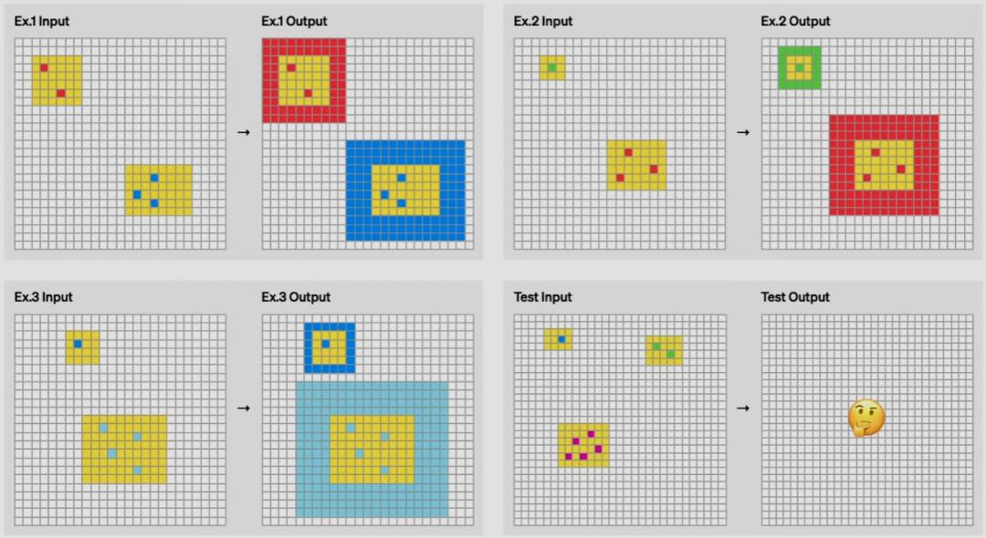 在 ARC-AGI 基准中,AI 需要根据配对的「输入 - 输出」示例寻找规律,然后再基于一个输入预测输出,下图展示了一些例子。参加过毕业季招聘或公务员考试的人或许对此类图形推理问题并不陌生。