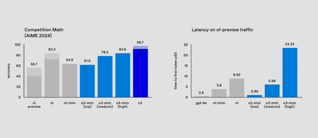 在数学问题上,o3-mini (low) 实现了与 gpt-4o 相当的低延迟。