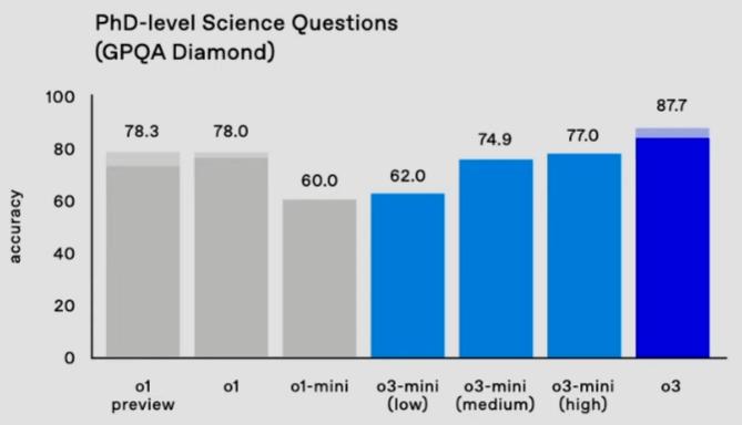 另外,他们也给出了在 GPQA Diamond 数据集上的更多测试结果。可以看到,o3-mini (low) 的结果与上面演示示例得到的结果基本一致,而 o3 满血版更是可以得到 87.7 的高准确度分数。
