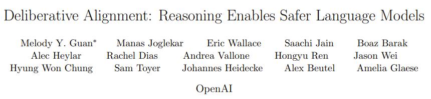 论文地址:https://assets.ctfassets.net/kftzwdyauwt9/4pNYAZteAQXWtloDdANQ7L/978a6fd0a2ee268b2cb59637bd074cca/OpenAI_Deliberative-Alignment-Reasoning-Enables-Safer_Language-Models_122024.pdf