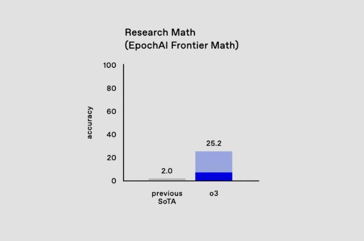 o3 在 OpenAI 研究人员认为最严格的基准之一(EpochAI Frontier Math)上的表现如下表所示。该数据集由新颖的、未发表的以及非常难、极其难的问题组成。