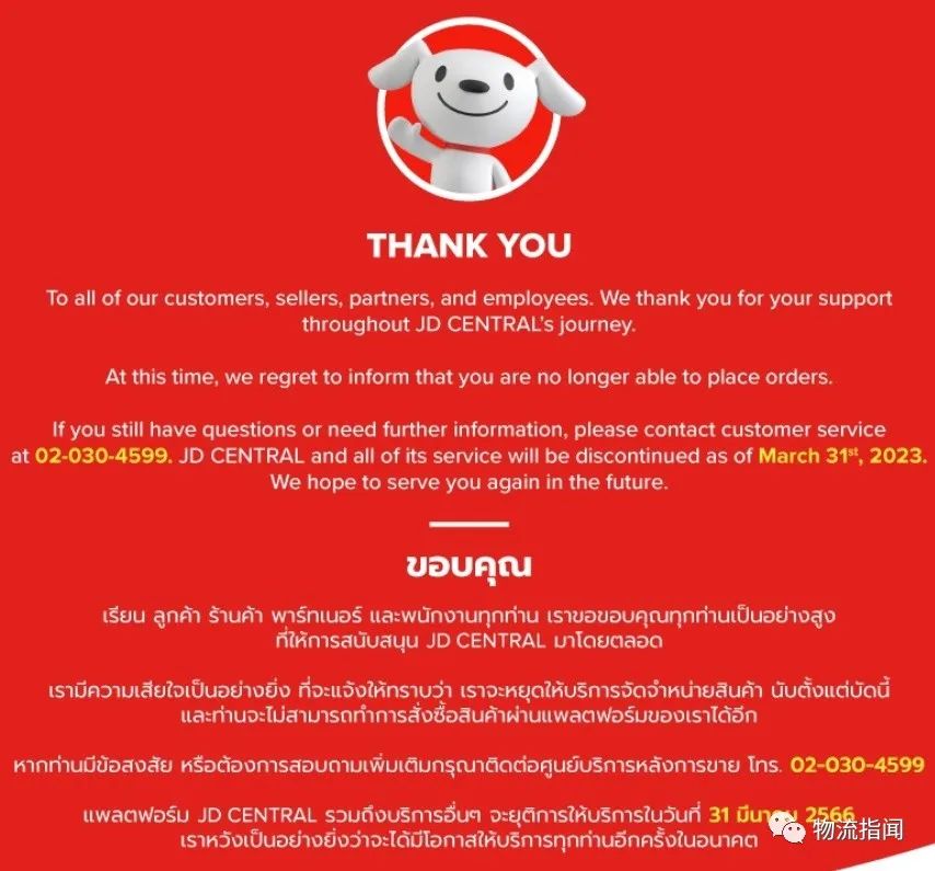 3月14日消息,京东泰国站(Jingdong Thailand)后台显示,2023年3月31日该站将停止所有服务。据悉,京东关闭泰国站是为了降本增效,集中资源投入到包括东南亚在内的跨境供应链基础设施中。