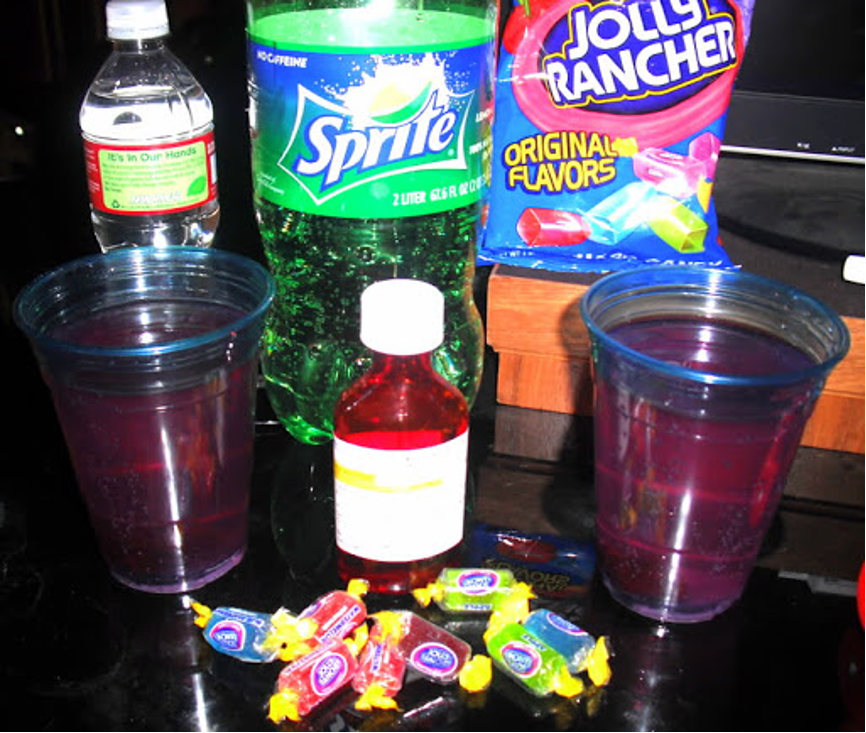 在美国,同样含有可待因,但多了异丙嗪、和右美沙芬的紫色止咳糖浆兑上葡萄味芬达,再加上Jolly Rancher 糖果和适量冰块,就变成了rapper们最喜欢的紫水。或者你可以随便怎么叫它:purple drank、lean或者dirty sprite。
