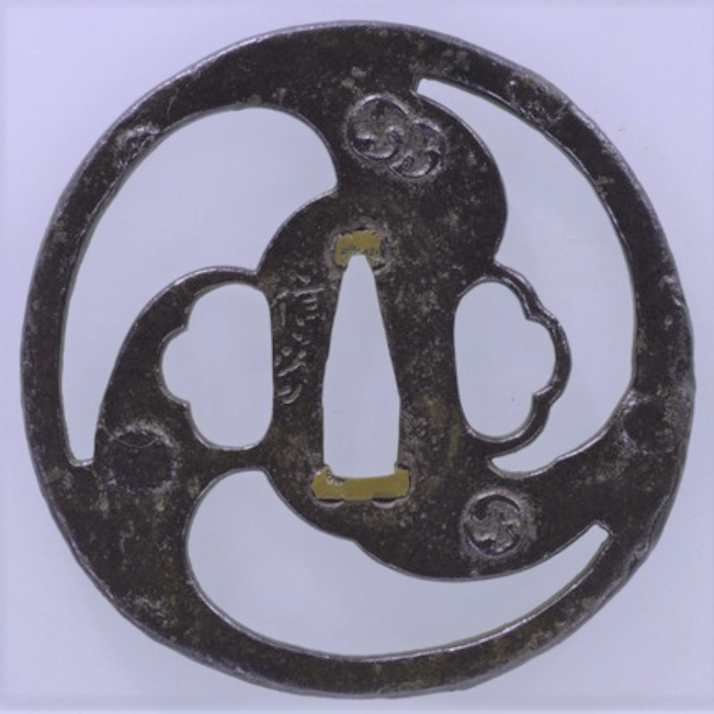 东京国立博物馆所藏的两枚刀锷。上:江户时代(18世纪)名匠所铸的“雨下猛虎图刀锷”,石窟前的岩石上刻有虎,滚滚云层和下方的狂澜以锄出雕和细雕方式表现,石窟上使用透雕。整体富有立体感,作品风格强劲有力,而虎的斑纹和波涛上的浪花则以金银镶嵌,透出细腻之感。下:安土桃山时代(16世纪)“巴透刀锷”,有镂空的大“三巴纹”,表面雕有小三巴纹和菊花纹的浮雕。边缘是略有厚度的角耳,到处可见被称为“铁骨”的用铁之妙,铁的质感十足。