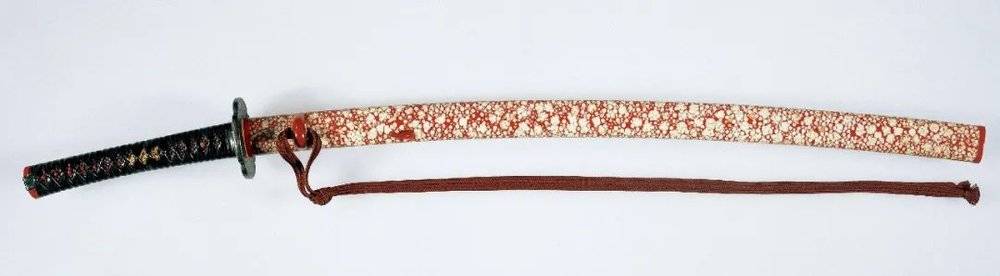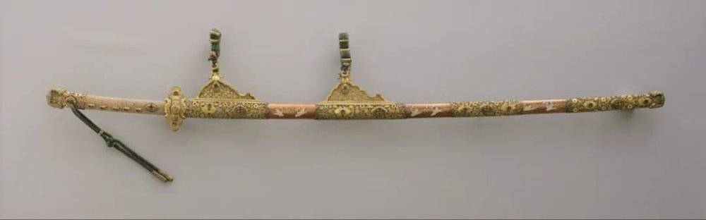 故宫博物院馆藏琉球进贡的“铜柄漆鞘腰刀”,这类刀在日本称为“梨花菊桐纹莳绘系卷太刀”,刀柄木质镶铜,缠紫色丝带,目贯嵌金菊桐纹。刀鞘梨木质,通体红地洒金漆,饰描金漆菊桐团花纹。鞘头尾饰件及箍为铜镀金质,鞘中部缠彩色丝带用以佩挂。图源故宫博物院。
