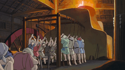 《幽灵公主》中踩风箱的女人们,动画中也出现过很多典型的日本刀,下图中众人所持的是一种叫作薙(tì)刀的日本刀。