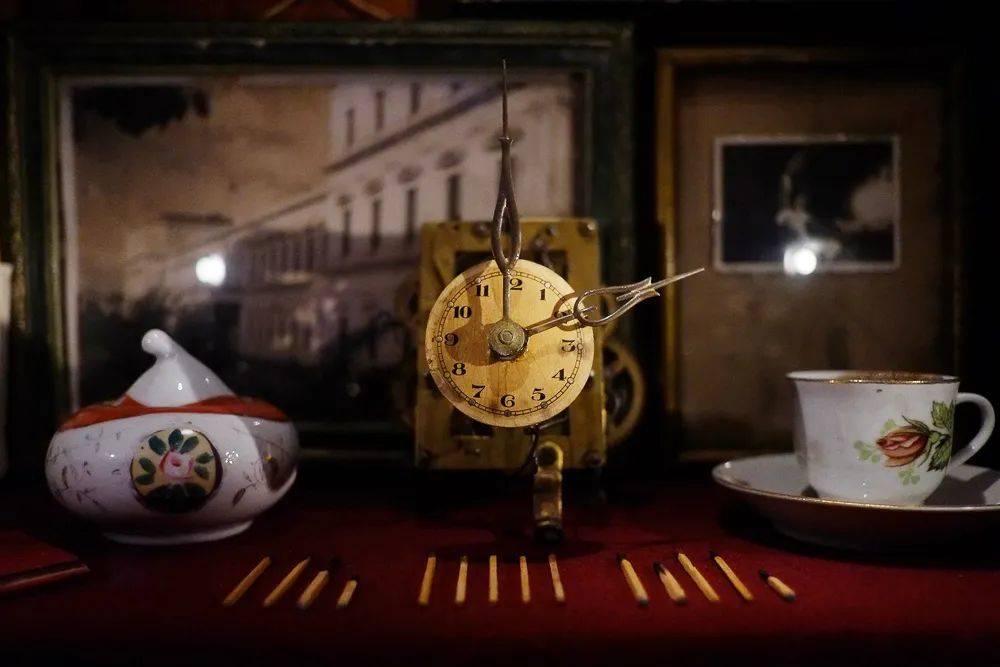 “用我在这里展出的钟、火柴和火柴盒,能够最好地讲述我是如何度过那十到十五分钟的,在那段时间里我会开始慢慢接受芙颂那天不会来的事实……当两点到来时,我不知道自己是应该高兴,因为约会的时间到了,还是应该伤心,因为此后的每一刻都在减少芙颂到来的可能。”(第25章 等待的痛苦)