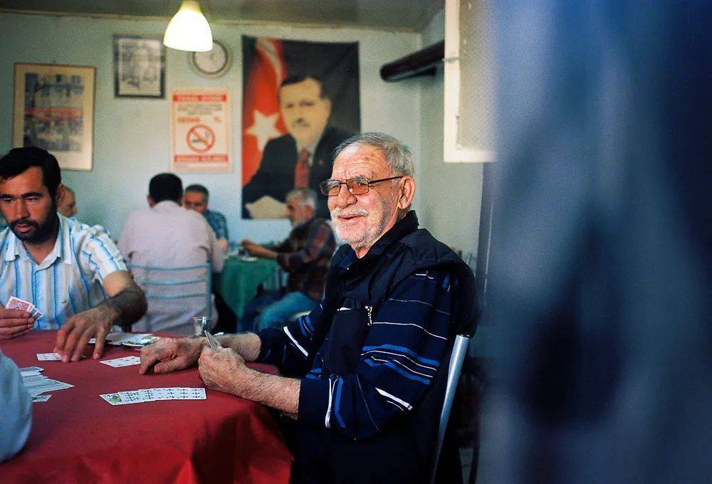 棋牌室里正在打扑克牌的老人,身后的墙壁上张贴着土耳其现任总统埃尔多安的海报。