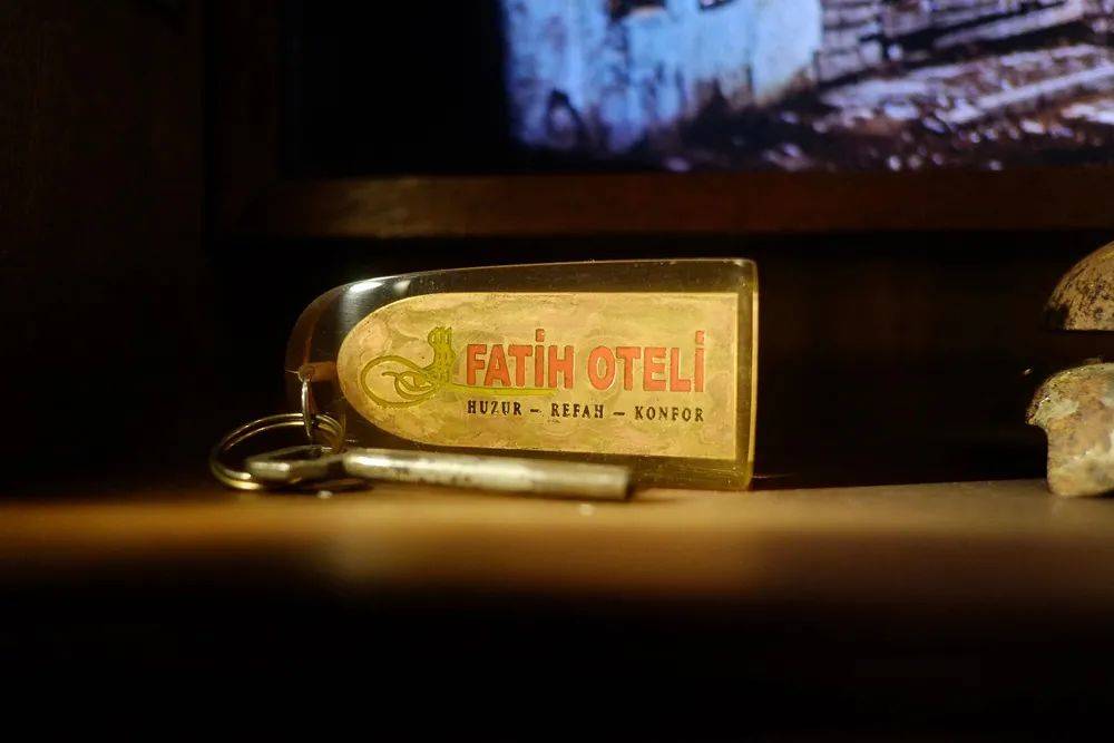 “在茜贝尔从巴黎回来的前两星期,也就是1月中旬,我收拾行李从别墅搬出来,开始住在法提赫和卡拉居姆吕克之间的一家酒店里。我在这里展出酒店的一把带有徽章的钥匙、印有抬头的信笺和多年后我得到的一块小招牌。”(第44章 法提赫酒店)