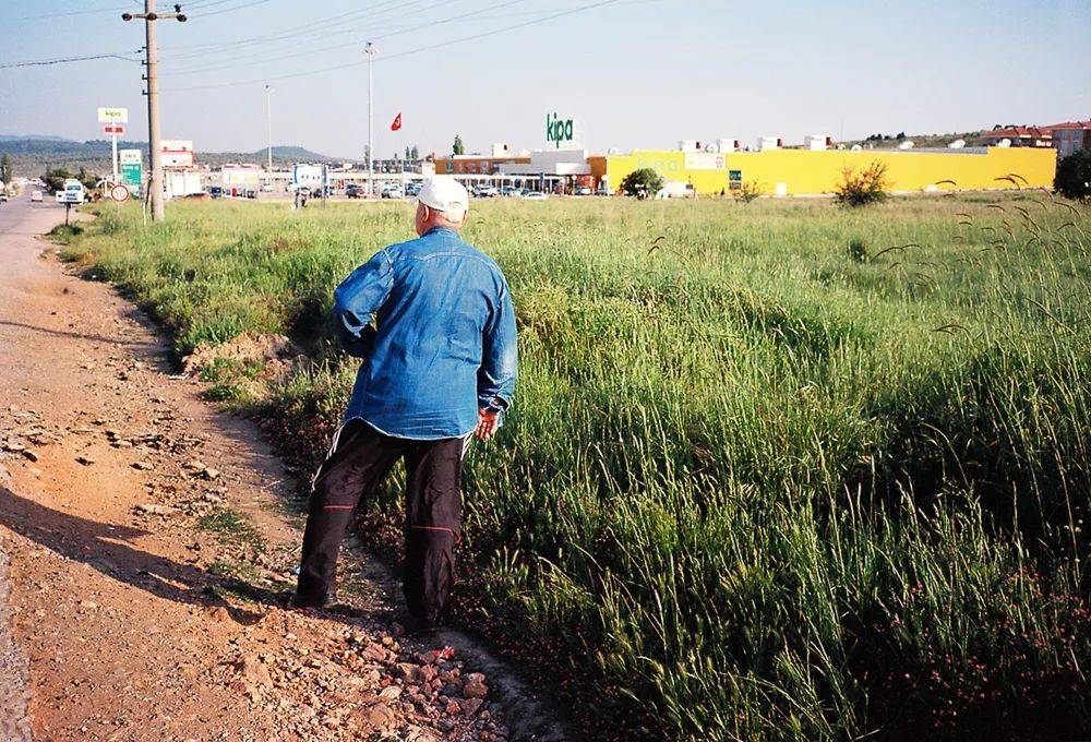城市郊外,一位在路边停下来歇脚的行人,不远处的黄色建筑是土耳其的大型连锁超市Kipa。