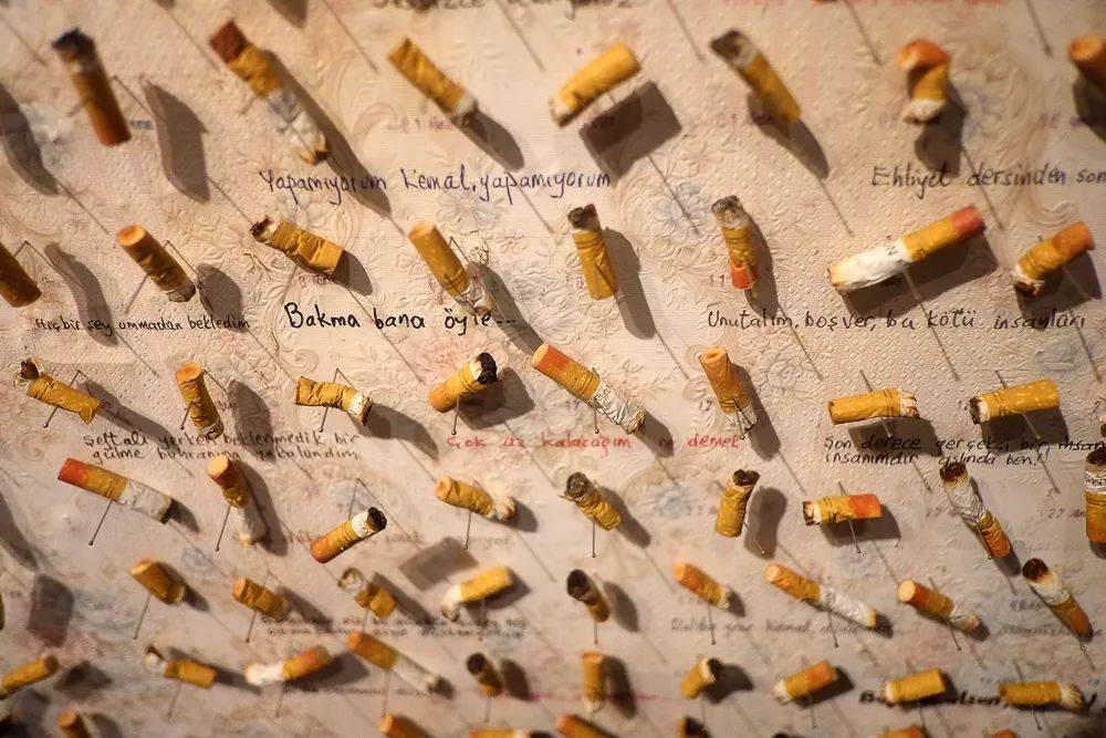 博物馆的一层,展示着男主人公凯末尔收集的4213个芙颂抽过的萨姆森牌烟头,它们像昆虫标本一样,被精心整理、注释,钉在贴有印花墙纸的墙上。9个方形的屏幕循环播放着一只女人手不停掐灭香烟的视频。