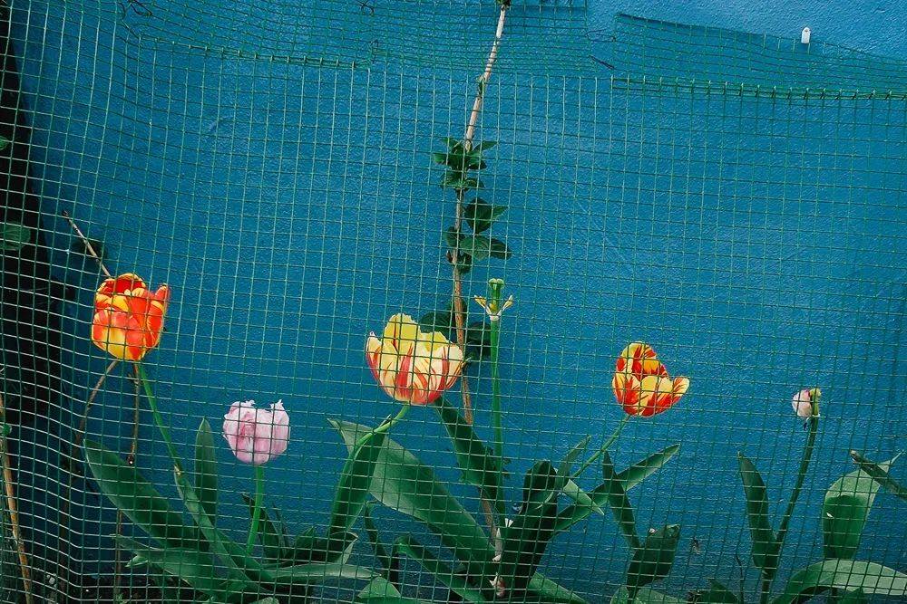 路边盛开的郁金香,仿佛博物馆里的一幅名画,被精心保护在绿网之下。