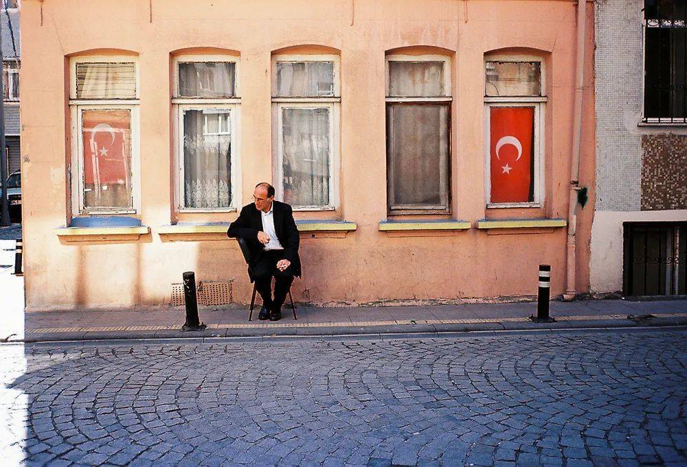 贝伊奥卢区,一个男人坐在两面星月国旗之间,悠闲地抽着烟。