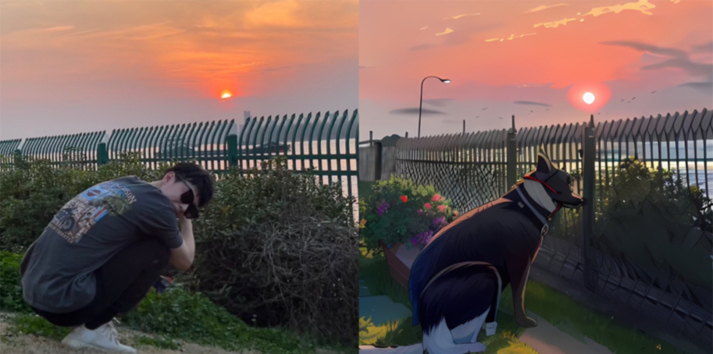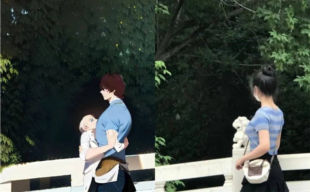 独自拍照的女生硬生生地被AI抓去脱单,对象是桥上的石狮子。在AI的世界里,女生变成了魁梧的男性,并与石狮子化身的白发少女热烈相拥。