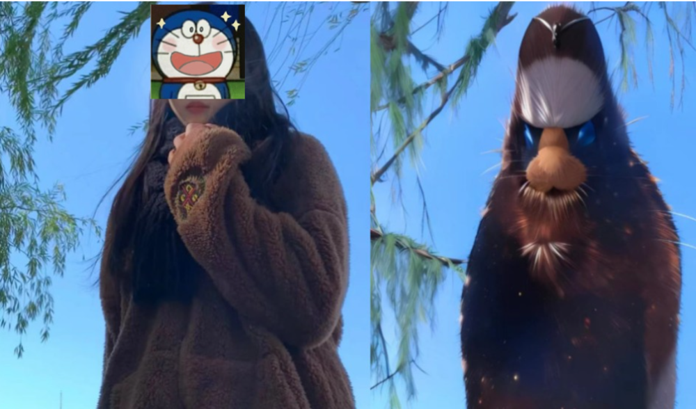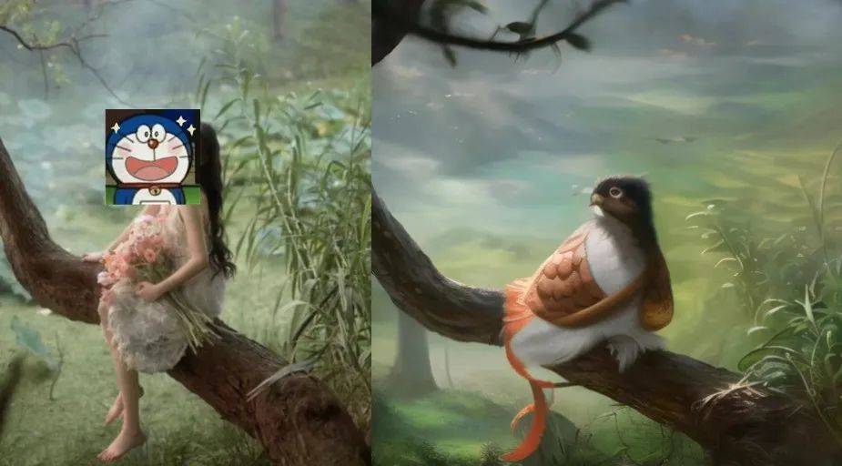原照片是一位网友的精致写真,四肢动作清晰无遮挡,本应该很容易转化为什么林间少女的主题画作。但AI的成果是,鸟披袈裟。