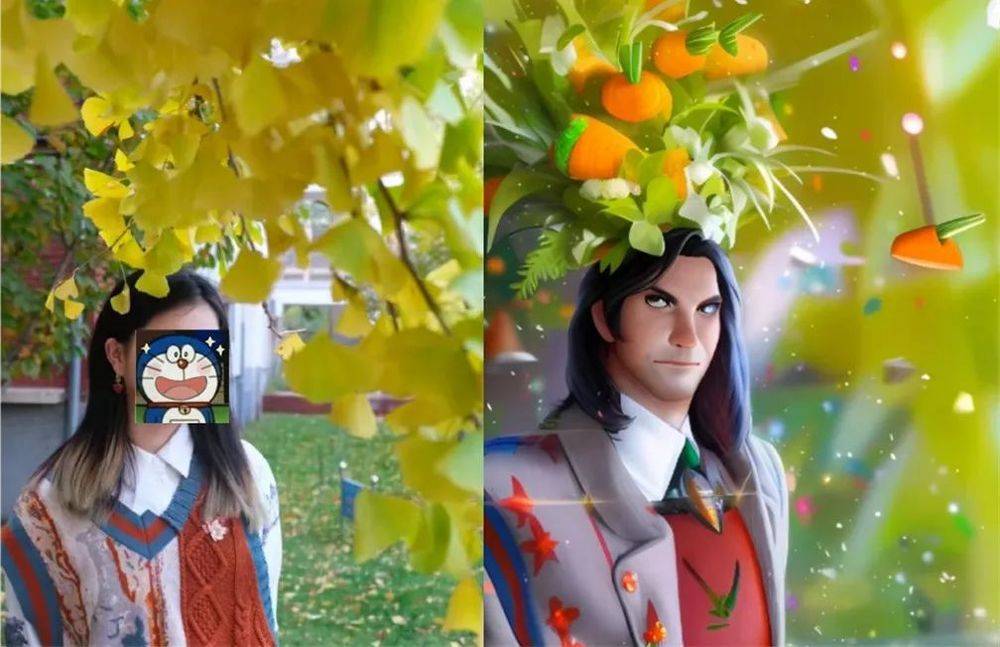 一张怎么看都是银杏树下、温柔少女的写真照片。在AI眼里,却变成了头顶胡萝卜、一副迪士尼反派嘴脸的奇怪男人。