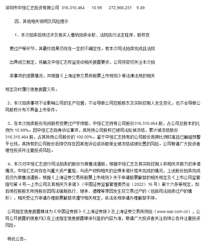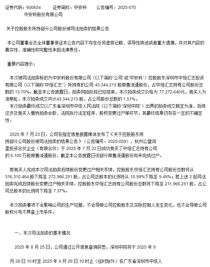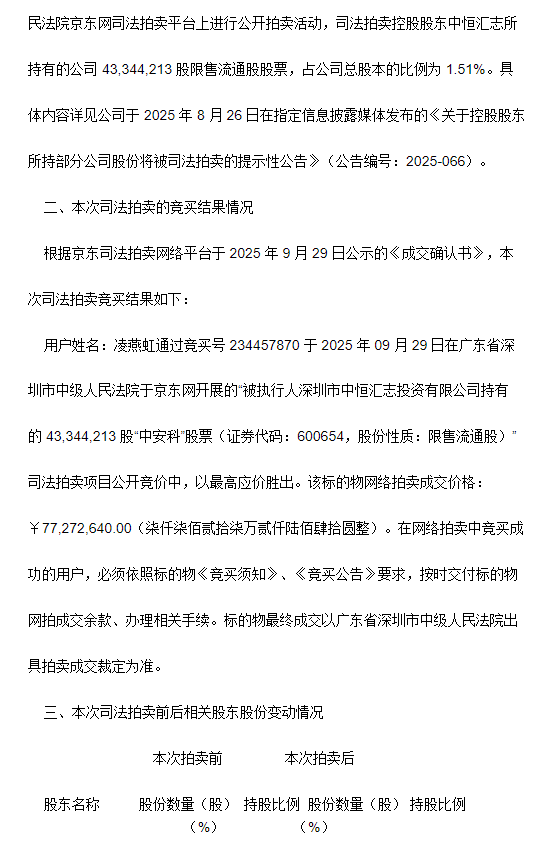 中安科:关于控股股东所持部分公司股份被司法拍卖的结果公告