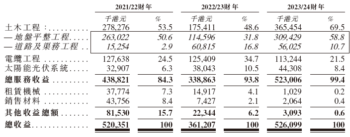 荣利营造的收入来自:1)土木工程,专注于地盘平整工程以及道路及渠务工程;2)电缆工程,专注于电缆挖沟、铺设及接驳工程;3)太阳能光伏系统工程,专注于太阳能光伏系统的设计、安装及维护工程。其他包括会临时向承建商及分包商租赁机械及买卖建筑材料。