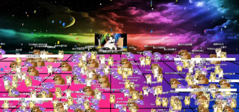 乌托邦不会成真,对夜店的平和想象自然也只会是虚拟。名为“修勾夜店”的线上夜店坐落于 B 站,每晚 9-10 点开门。只需发送“创建角色”弹幕,你就能创建一只自己的赛博 cheems 小狗、开始热舞。因为我蹦的是十二点多结束的养生迪、在离场时它还未熄灯,数万只狗仍在里面狂欢,所以打烊时间不详,似乎凌晨两点还有狗友在里面。