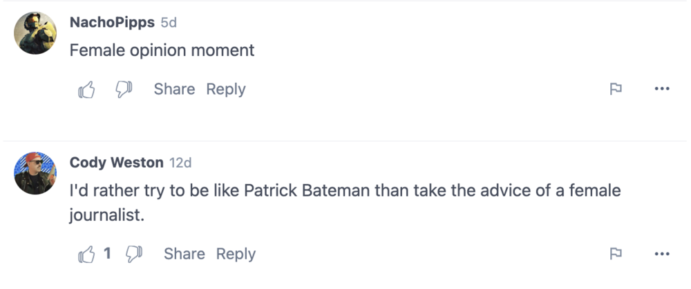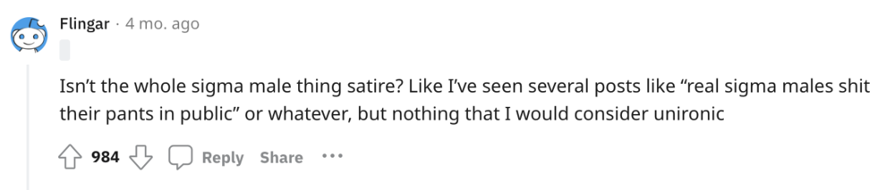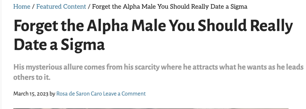 就像在一篇讨论西格玛男人的文章评论区下面,唯二的两条评论是: