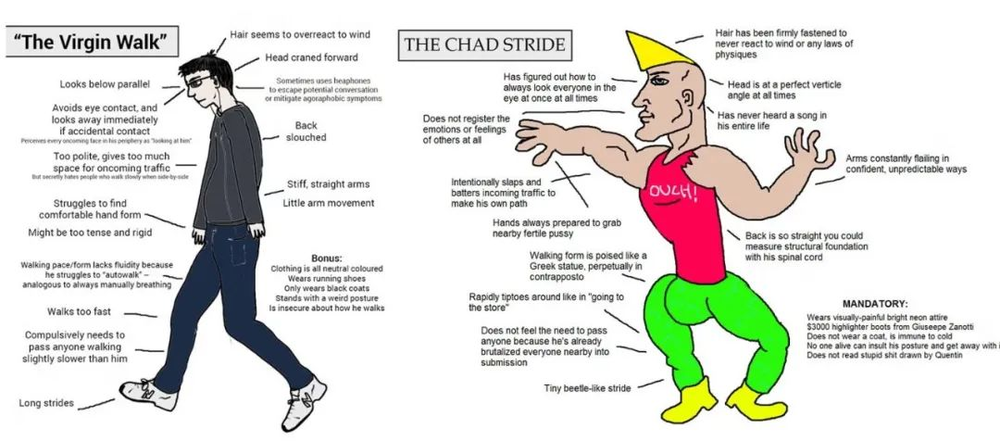 处男是软弱的老实人;查德是翘屁肌肉猛男,女友多如牛毛。