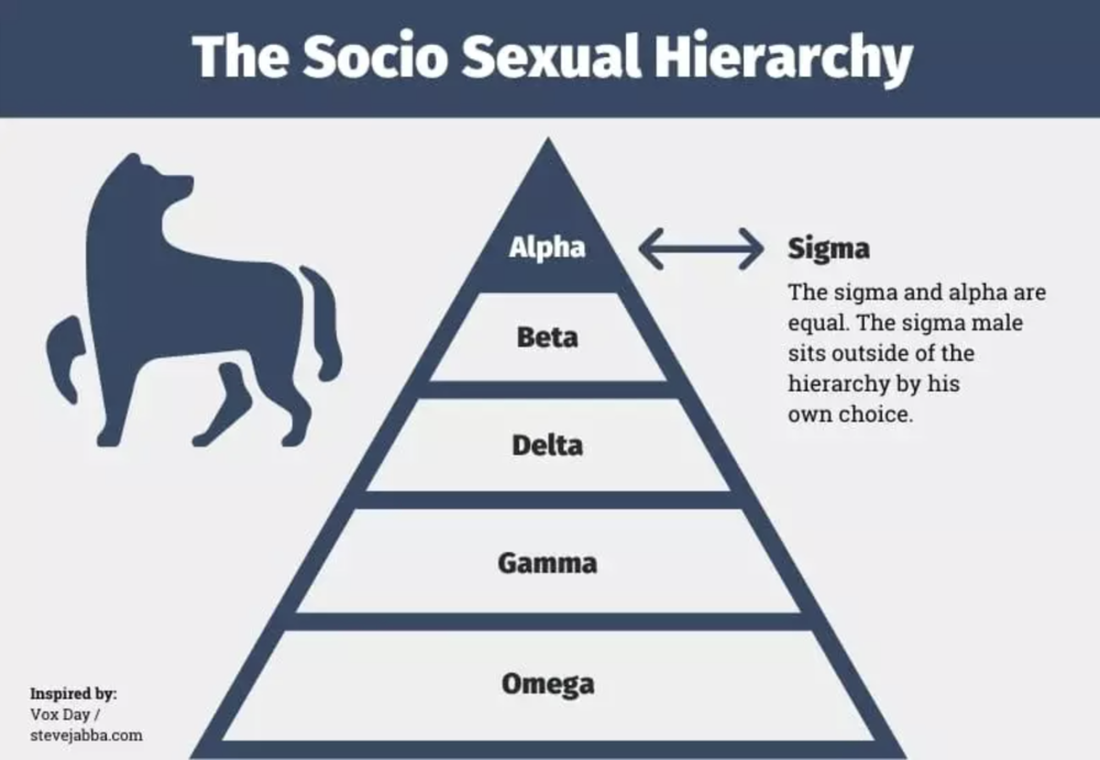 根据Vox Day提出的“社会性别等级制度”理论,如果世界是一个王宫,Alpha男就是毋庸置疑的皇帝本人,对应所有传统电影里的英雄男主角;Beta男是Alpha的副官或左右手,可以类比《权力的游戏》中的小指头;Delta男是数量最多的工兵和炮灰;Gamma男是街头不务正业的小混混;Omega男处在最底层,手无缚鸡之力,被视为娘炮废物。