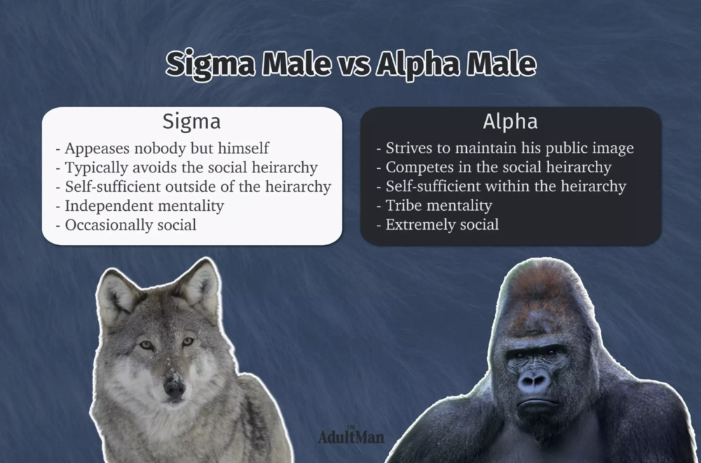 拿动物举例,阿尔法男人是具备极强领导力的黑猩猩,他勇于承担种群的责任,注重等级秩序,也非常擅长和所有人打交道;而西格玛男人是沉静内敛的孤狼,他内向独立,不取悦任何人,远离人民群众,也不会对任何组织负责。
