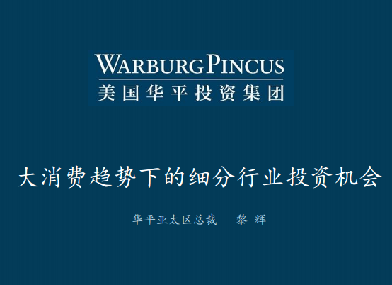 谢谢大家!我在这里见到了很多年没见到的一些老朋友,今天的话题也很多样。我今天主要是跟大家很简短地分享一下我们华平在中国投资的主要的主题和主要大的趋势。我们在中国也已经有20年的历史,从1994年最早进入中国,可能在一些比较大的国际性的投资公司里面我们是比较早进入中国的,在20年里面我们也是经历了中国经济周期的风风雨雨,到今天也有一些心得。