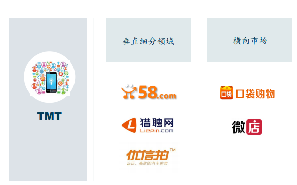 另外一个主题,我们在中国的投资非常重要的TMT领域。华平是以中后期投资、成长型投资为主的投资基金,但在TMT领域里面我们也做了很多早期的探索和投资。在TMT领域我们觉得有两大的方面机会,一个是垂直领域的市场机会,即垂直领域大的流量入口,尽管BAT在市场格局非常明显。在垂直领域里面还是有很多机会的。投资在分类信息、58同城在招聘投资了猎聘,都出现了垂直领域的领导者,还是会有很多投资的机会。