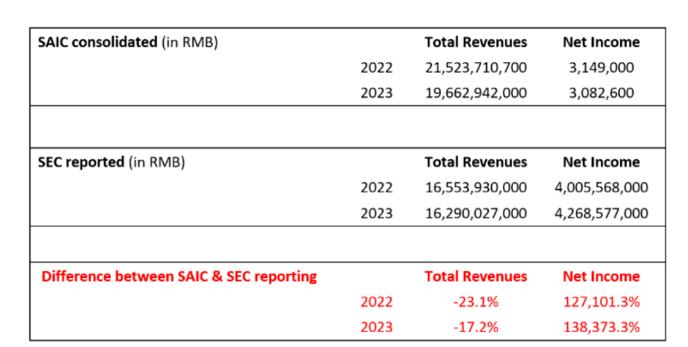 2023年公司向国家工商总局申报的净利润,与财报披露的净利润,分别为308万元和43亿元,两者相差1384倍。即使会计处理方式不同,但仍无法掩盖如此大的利润差异。