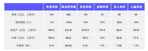 2023年,包括奇富科技、陆金所控股、信也科技、嘉银科技、宜人金科、小赢科技在内的6家企业市值普遍低于总资产,甚至陆金所、嘉银科技等企业的市值更是低于营收,宜人金科、小赢科技的PE更是不足2倍。