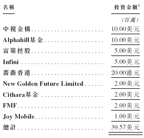 迅策是次IPO招股引入9名基石投资者,合共认购约3.08亿港元的发售股份,基石投资者包括中视金桥(00623.HK)、Alphahill基金、富策控股(龚虹嘉先生全资)、Infini(无极资本)、蔷薇香港、New Golden Future(Yunfeng)、Cithara基金(信廷)、FMF(FML)、Joy Mobile(Chen Qiuying女士全资)等。
