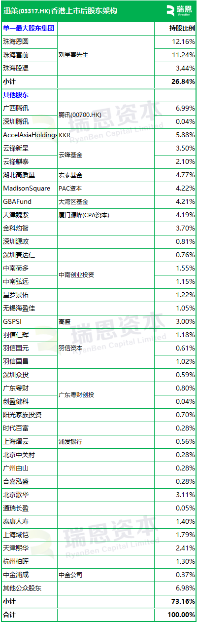 招股书显示,迅策在上市前的股东架构中,刘呈喜先生通过控制数家实体合计持股约26.84,为单一最大股东;其他投资者包括腾讯(00700.HK)、KKR、云锋基金、湖北高质量、PAC资本、大湾区基金、厦门源峰(CPA资本)、金科灼智、高盛、中南创业投资、羽信资本、天津熙华、广东粤财创投等;其他公众股东持股6.98%。