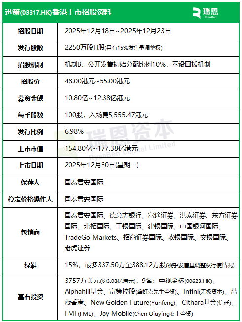 来自深圳南山区的实时数据基础设施及分析解决方案供货商迅策(03317.HK),于今日(12月18日)起至下周二(12月23日)招股,预计2025年12月30日在港交所挂牌上市,国泰君安国际独家保荐。