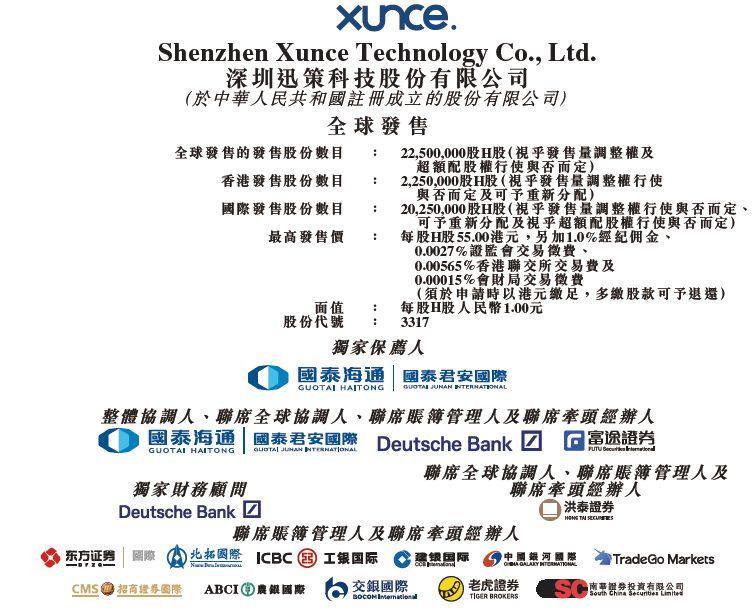 假设每股发售价51.50港元(发售价范围中位数)、发售量调整权及超额配股权悉数行使,迅策预计上市总开支约1.39亿港元,包括3.5%的包销佣金,1%的酌情奖金,其他连同联交所上市费、证监会交易征费、联交所交易费、财汇局交易征费、法律及其他专业费用、印刷及其他开支等。
