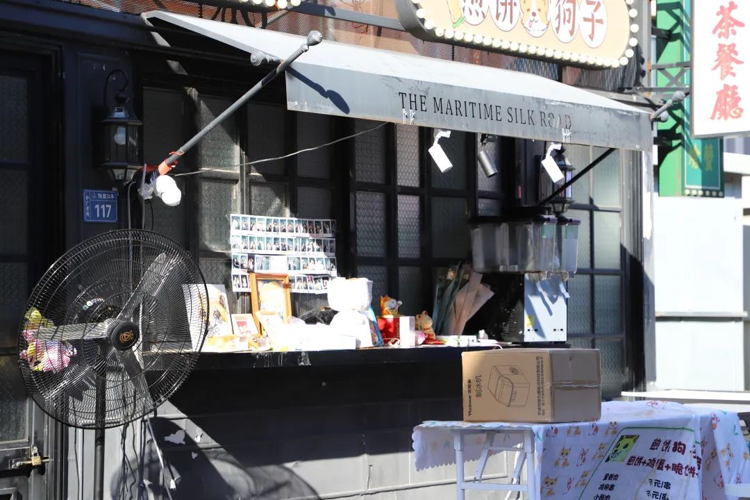 当天下午16:14,我来到狗头萝莉的煎饼摊前,一个大约5米宽的小店面:招牌上写着“煎饼狗子”几个大字,窗台上放了一排粉丝送的礼物,包括一只招财猫、一只发财狗、一个写着“煎饼狗子”的画框,还有一些粉丝和狗头萝莉的合影。