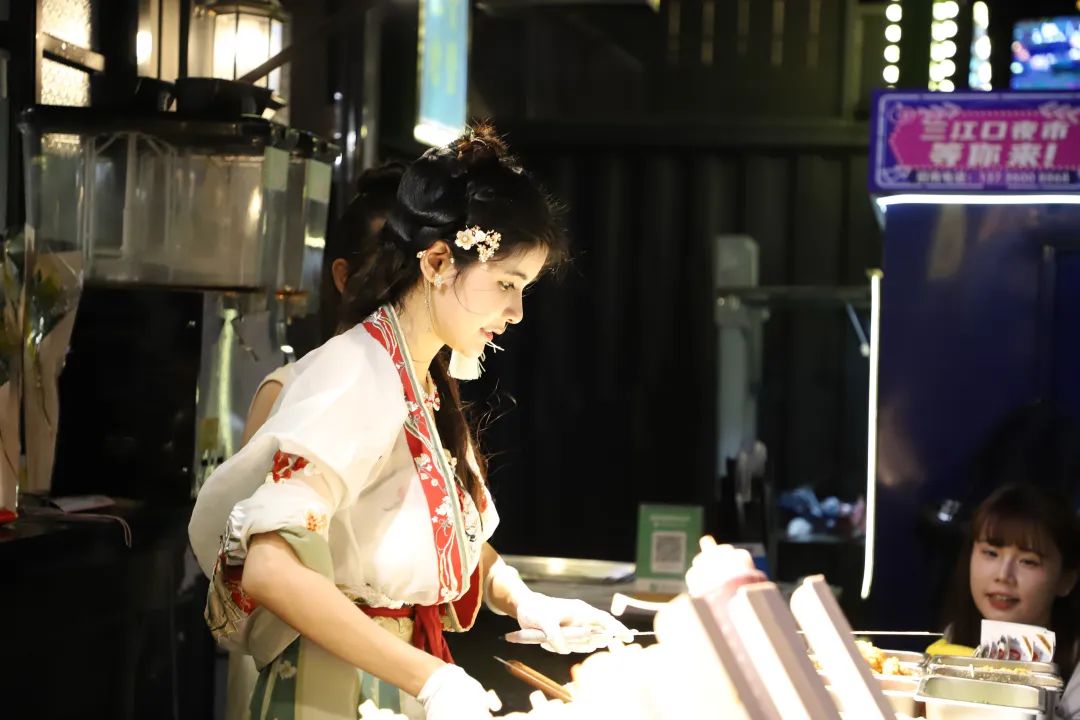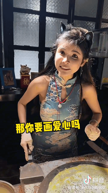 此时,天色已经全黑,排队的人群依次来到煎饼摊前,拿到“志愿者”提前打好的鸡蛋后,就可以走到狗头萝莉旁边等到她把面糊摊好,再把鸡蛋倒上去。摊煎饼的过程中,狗头萝莉会一边打散鸡蛋一边询问煎饼要加什么配料,要辣还是不辣,合影是要比心还是比剪刀手。