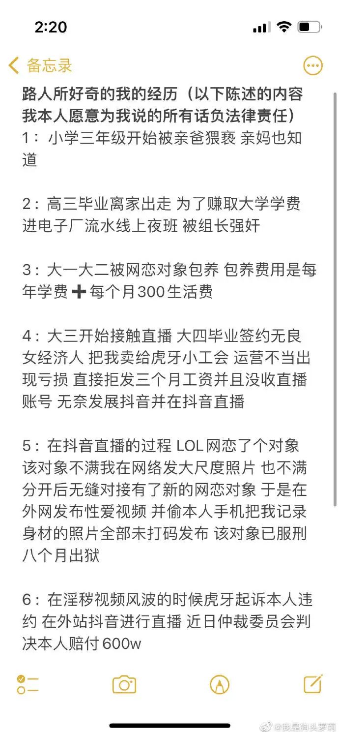 2022年1月,狗头萝莉曾在社交账号讲述个人经历:大学时被包养,直播违约被索赔600万元……这些复杂的经历更是加剧了她身上的争议。