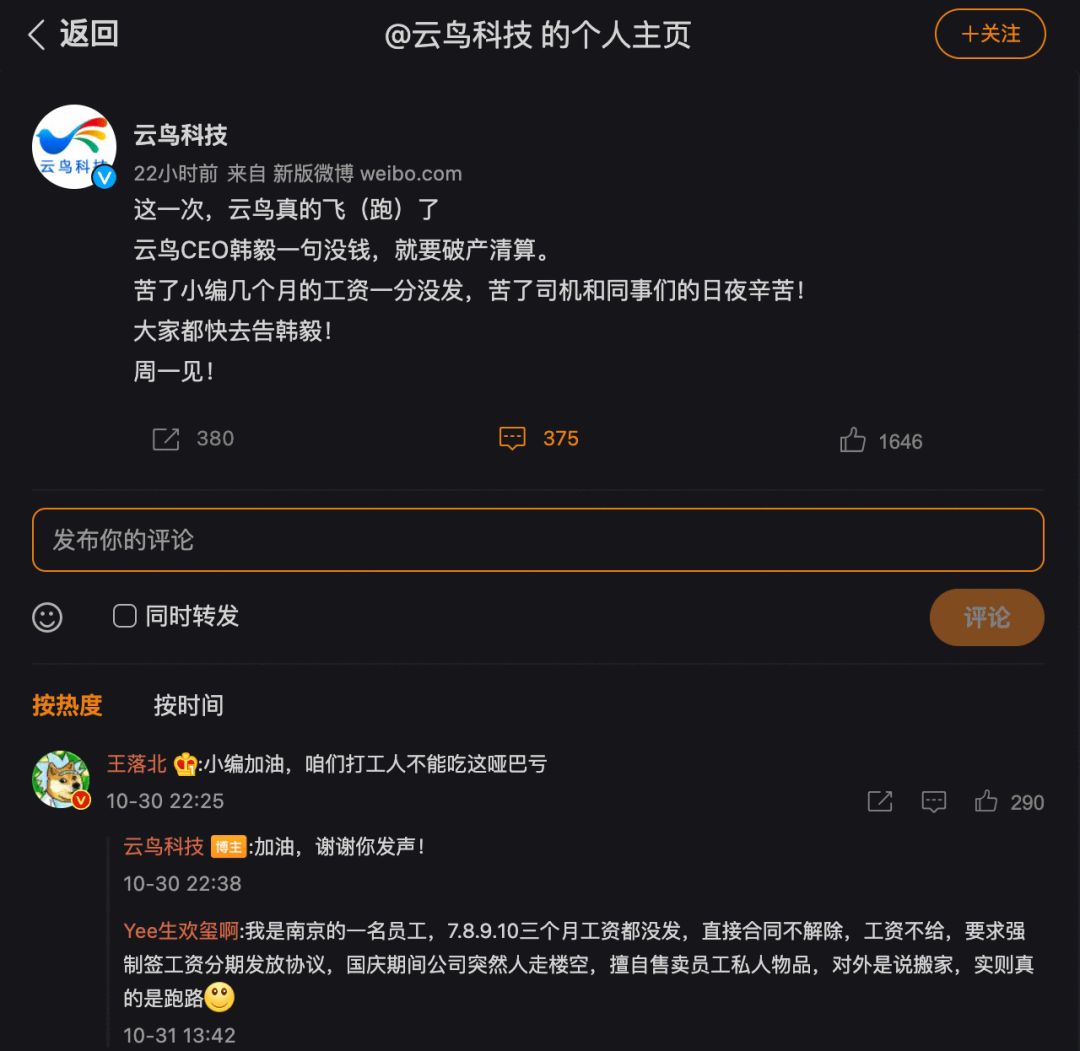 10月31日消息,昨日晚间,云鸟科技官微直接发声,号召司机和员工们去告公司CEO韩毅,因为公司马上要破产清算了。