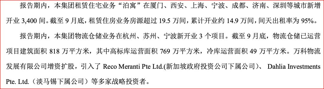 10月28日晚间,万科发布2021年第三季度报告。公告显示,报告期内,万科集团物流仓储业务在杭州、苏州、宁波新开业 3 个项目。截至 9 月底,物流仓储已运营 项目建筑面积 818 万平方米,其中高标库运营面积 769 万平方米,冷库运营面积 49 万平方米。万科物流发展有限公司增资扩股,引入了 Reco Meranti Pte Ltd.(新加坡政府投资公司下属公司)、 Dahlia Investments Pte. Ltd.(淡马锡下属公司)等多家战略投资者。